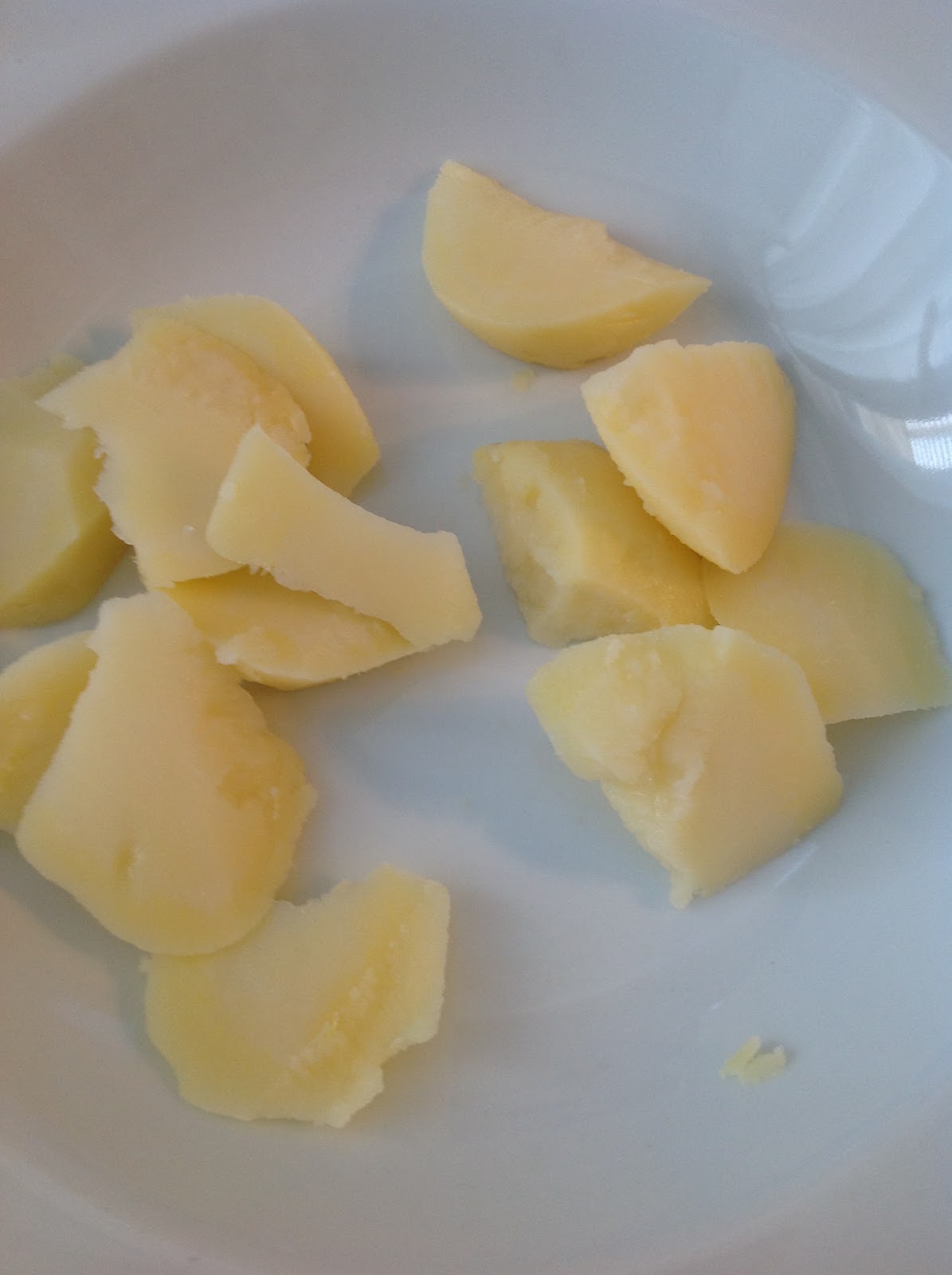 Las picamos en trozos majetes ya que al revolver con la vinagreta algo de la patata se pierde en el roce con el resto del aliño y si las picamos "menuitas" prácticamente desaparecen.