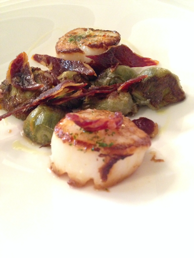 Vieras asadas, alcachofas y crujiente de ibérico. Todo un derroche de producto de excelente calidad. La viera en su punto, alcachofas pequeñas (toda una delicatessen) cocidas y pasadas por la plancha. Una pena porque estaban más hechas de lo que deberían y el crujiente era muy grueso. El plato, rico en sabor y excelso en producto. Cuidando un poco más el punto de la alcachofa y aligerando el crujiente podría ser memorable.
